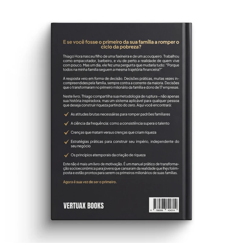 O Primeiro Milionário da Família é um livro direto, prático e poderoso, escrito por Thiago Hora, jovem empreendedor que rompeu o ciclo da pobreza e se tornou multimilionário antes dos 21 anos. Filho de uma faxineira e de um açougueiro, Thiago começou como empacotador de supermercado e barbeiro, até descobrir que decisões diferentes geram destinos diferentes e decidiu se tornar a locomotiva da própria vida.